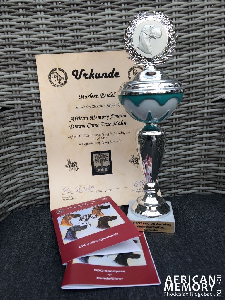 African Memory Amabo Dream Come True „Malou“ besteht die Begleithundeprüfung, samt Verhaltenstest und Unbefangenheitsprobe (BH/VT) unter VDH-Leistungsrichterin Resi Rübbelke mit Bravour.