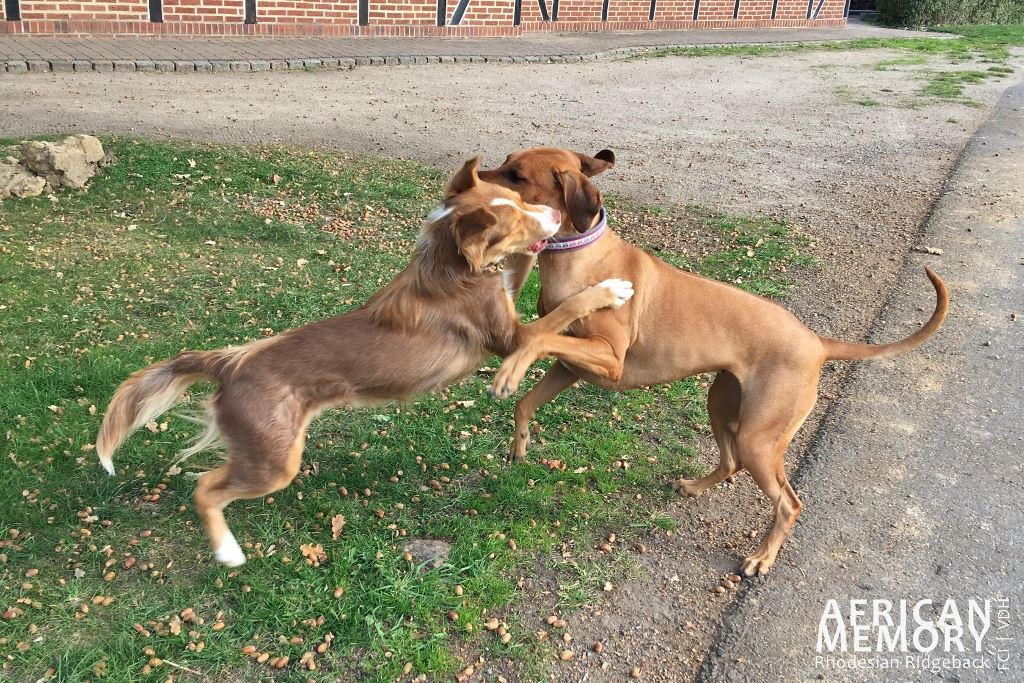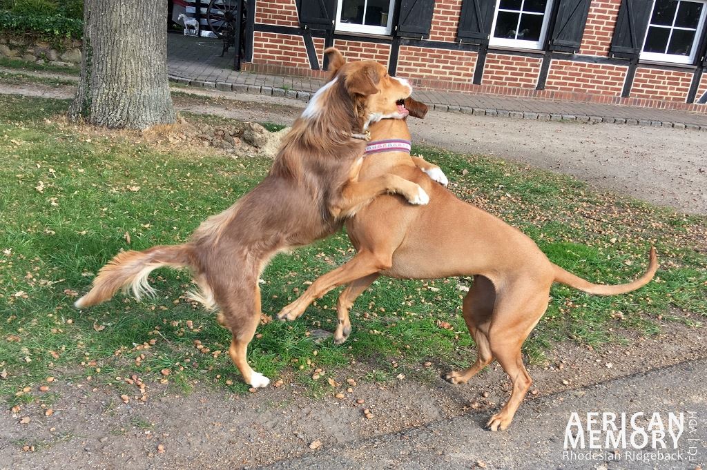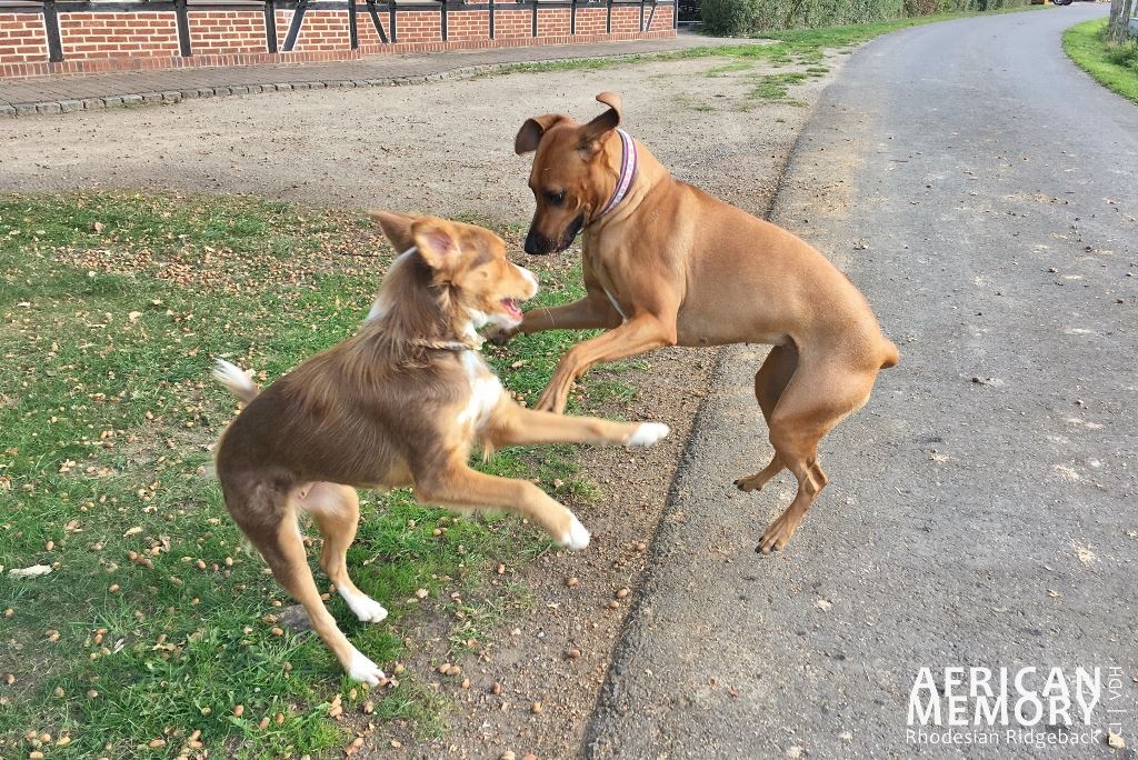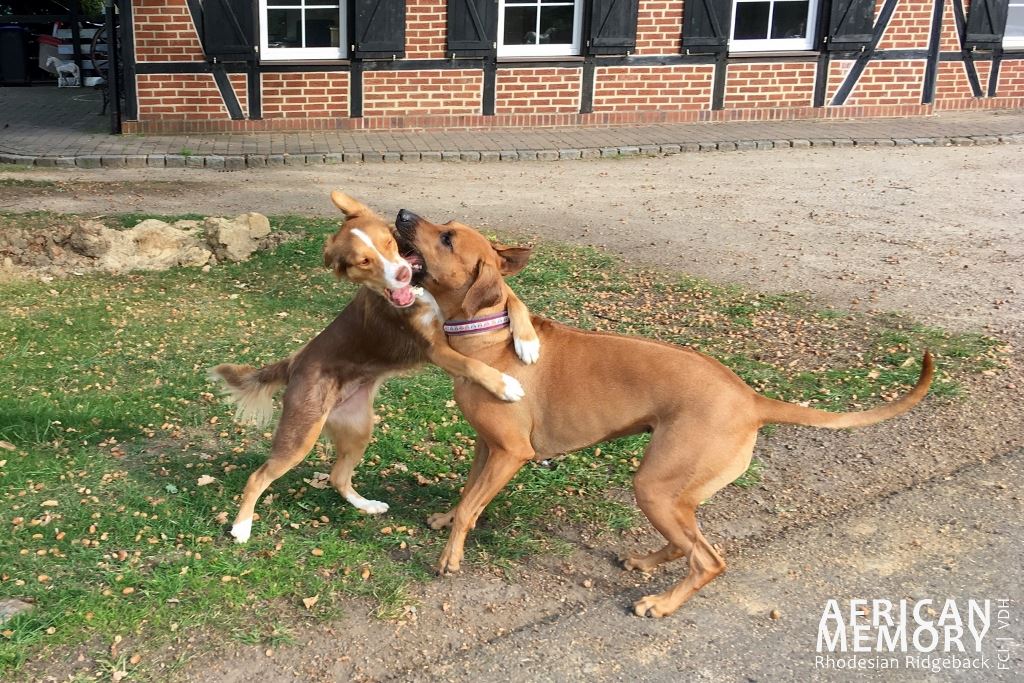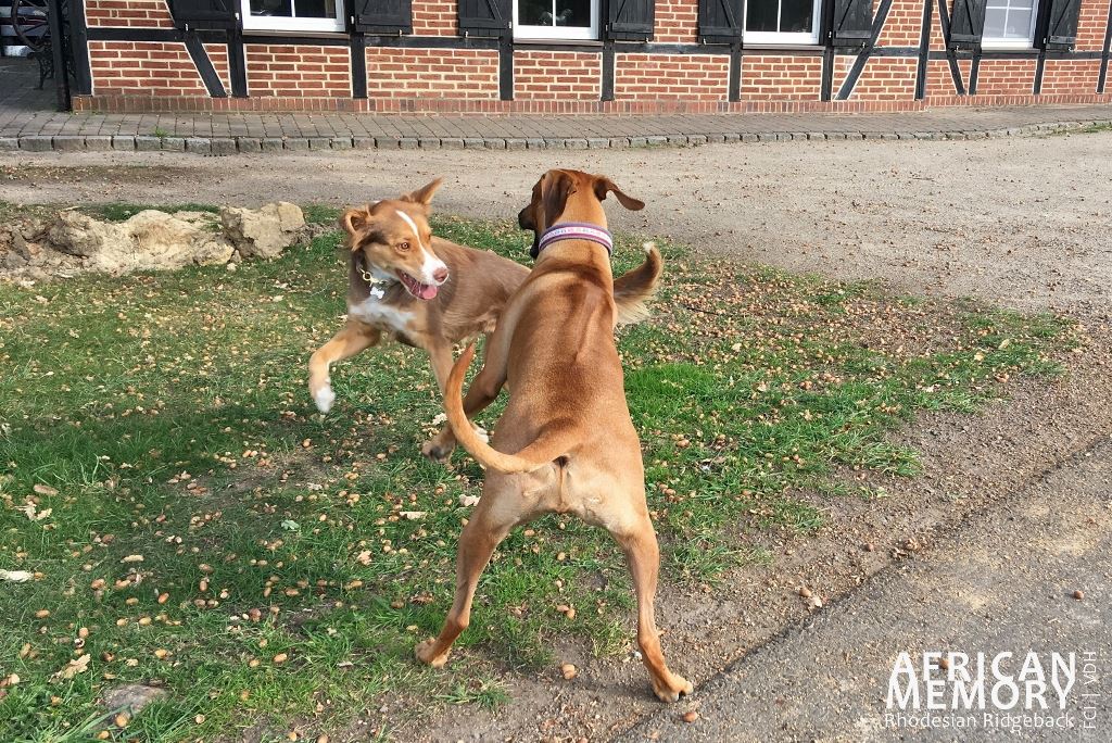 Da sich unser Alltag schon seit einiger Zeit hauptsächlich um Amali dreht, kommt unsere „Kleine“ nicht selten zu kurz. Wir bemühen uns unsere Mädels mit Suchaufgaben daheim geistig auszulasten. Daran haben beide viel Freude. Daniel fährt regelmäßig Fahrrad mit Malou, sie liebt es entlang der Werse mit Herrchen um die Wetter zu „rennen“. Das Sozialspiel mit ihrer Mutter und anderen Artgenossen können wir aber nicht ersetzen – wo Malou doch ein wahres Wunderkind in Sachen Sozialkompetenz ist.